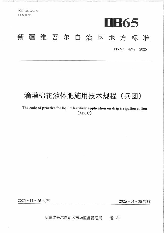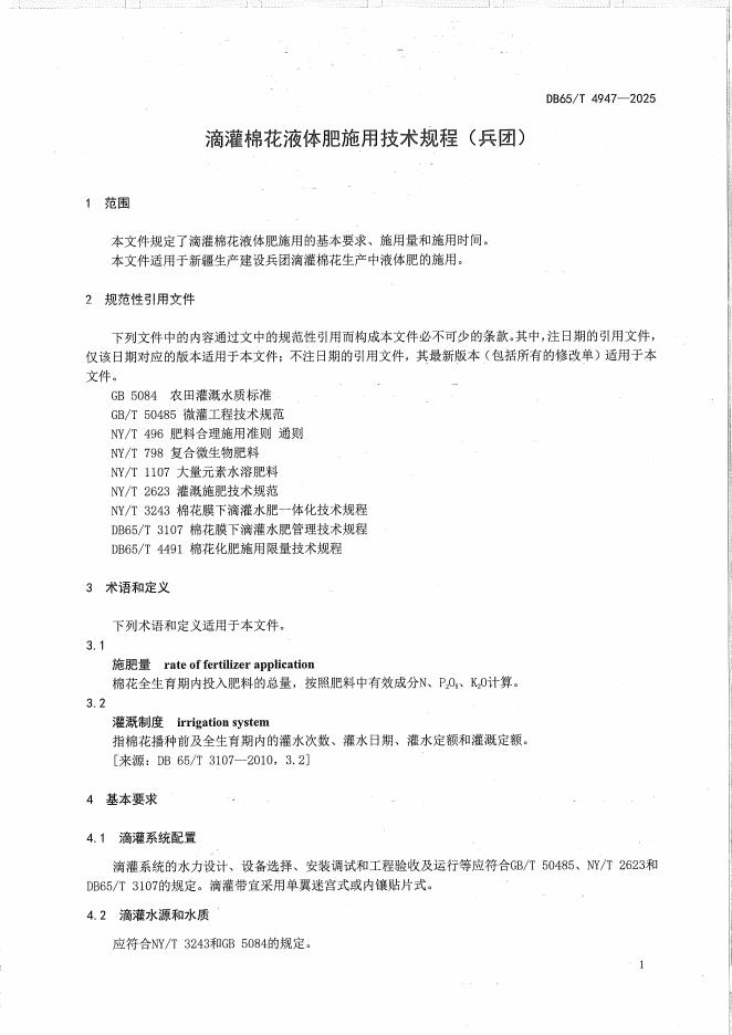 DB65/T 4947-2025 滴灌棉花液体肥施用技术规程(兵团)