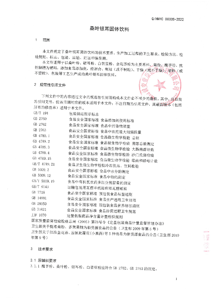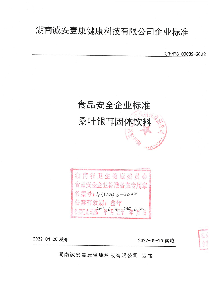 Q/HNYC 0003S-2022 桑叶银耳固体饮料