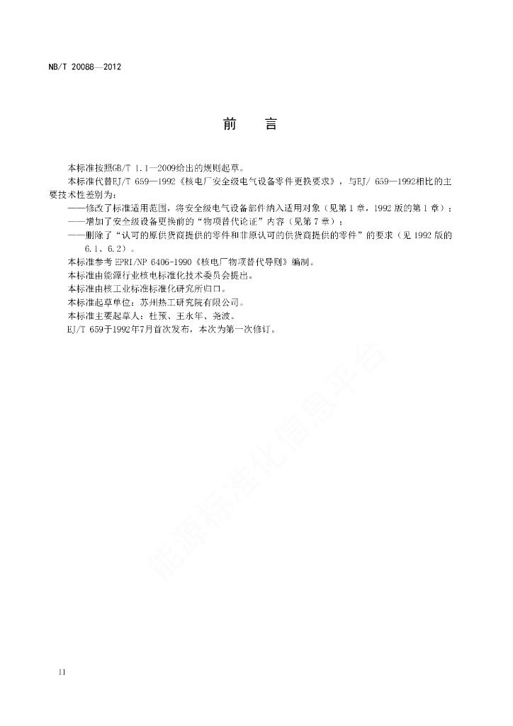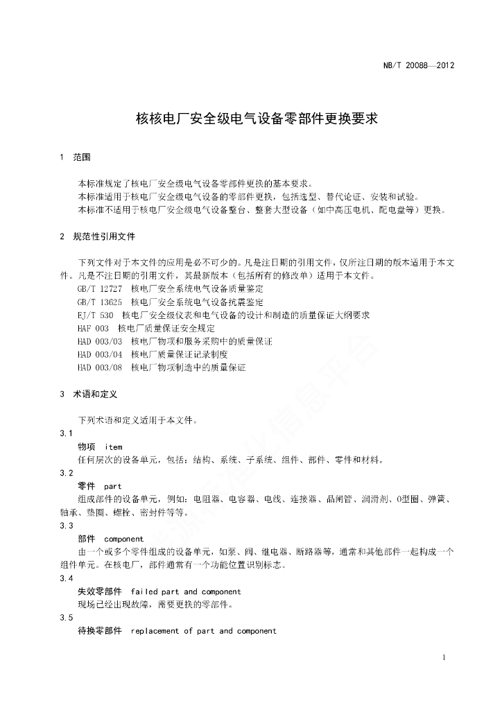 NB/T 20088-2012 核电厂安全级电气设备零部件更换要求