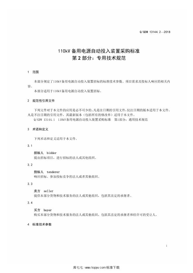 Q/GDW 13144.2-2018 110kV备用电源自动投入装置采购标准 第2部分:专用技术规范