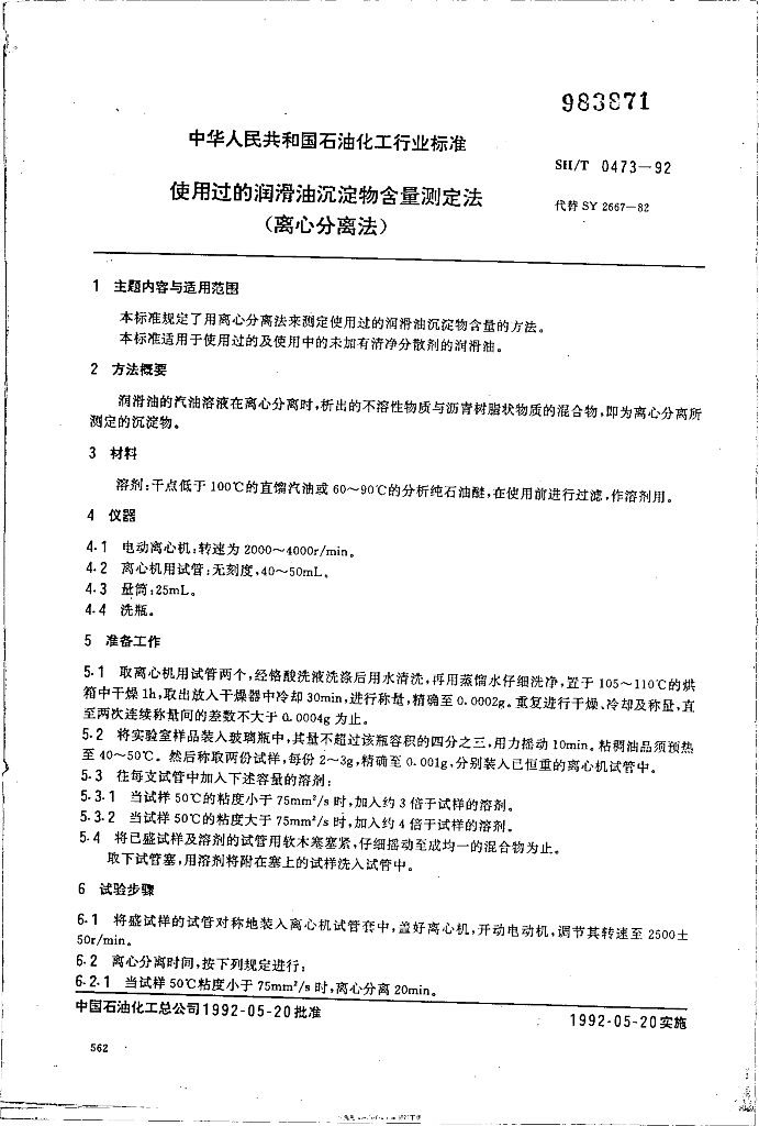 SH/T 0473-1992 使用过的润滑油沉淀物含量测定法(离心分离法)