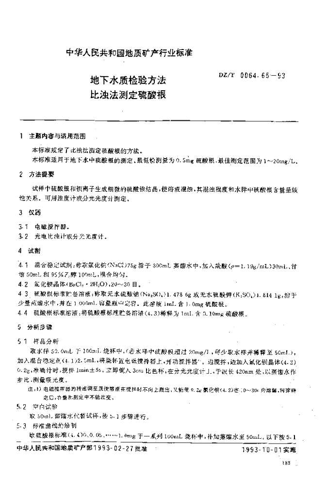 DZ/T 0064.65-1993 地下水质检验方法 比浊法测定硫酸根