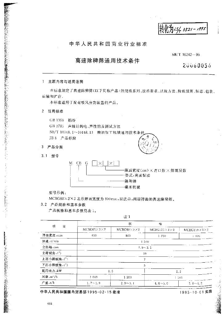 SB/T 10242-1995 高速除稗筛通用技术条件