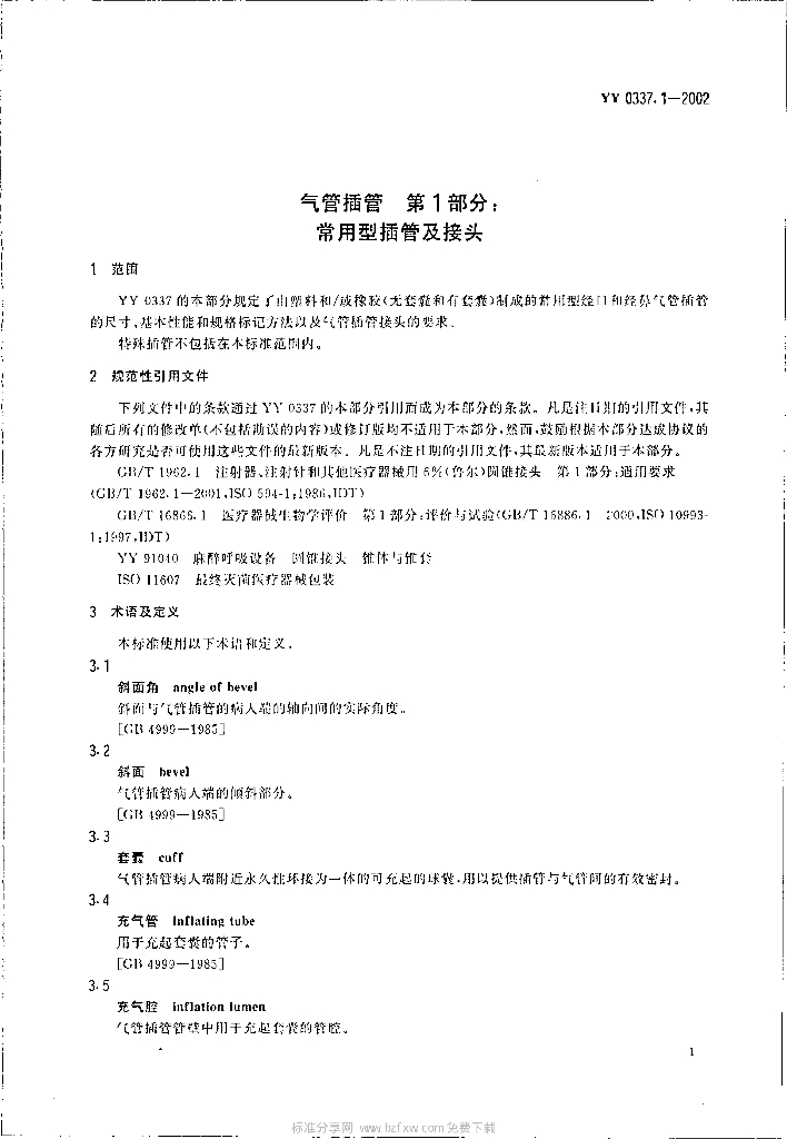YY 0337.1-2002 气管插管 第1部分:常用型插管及接头