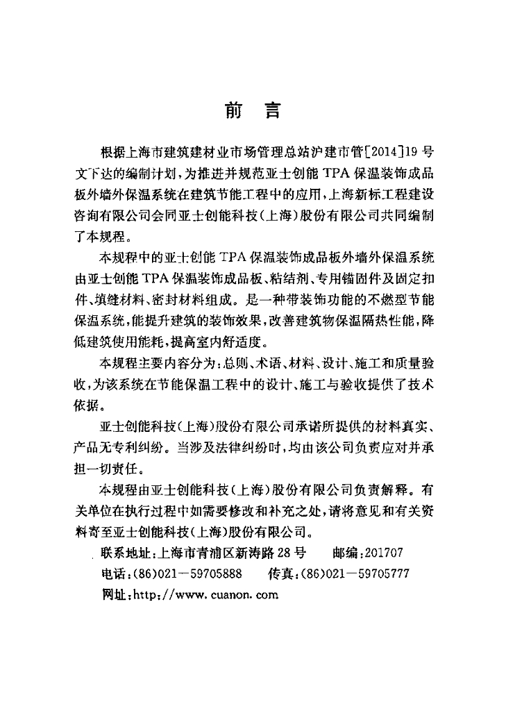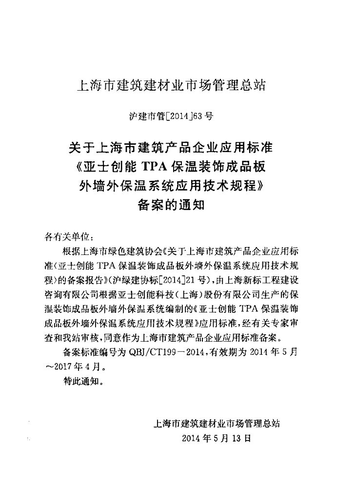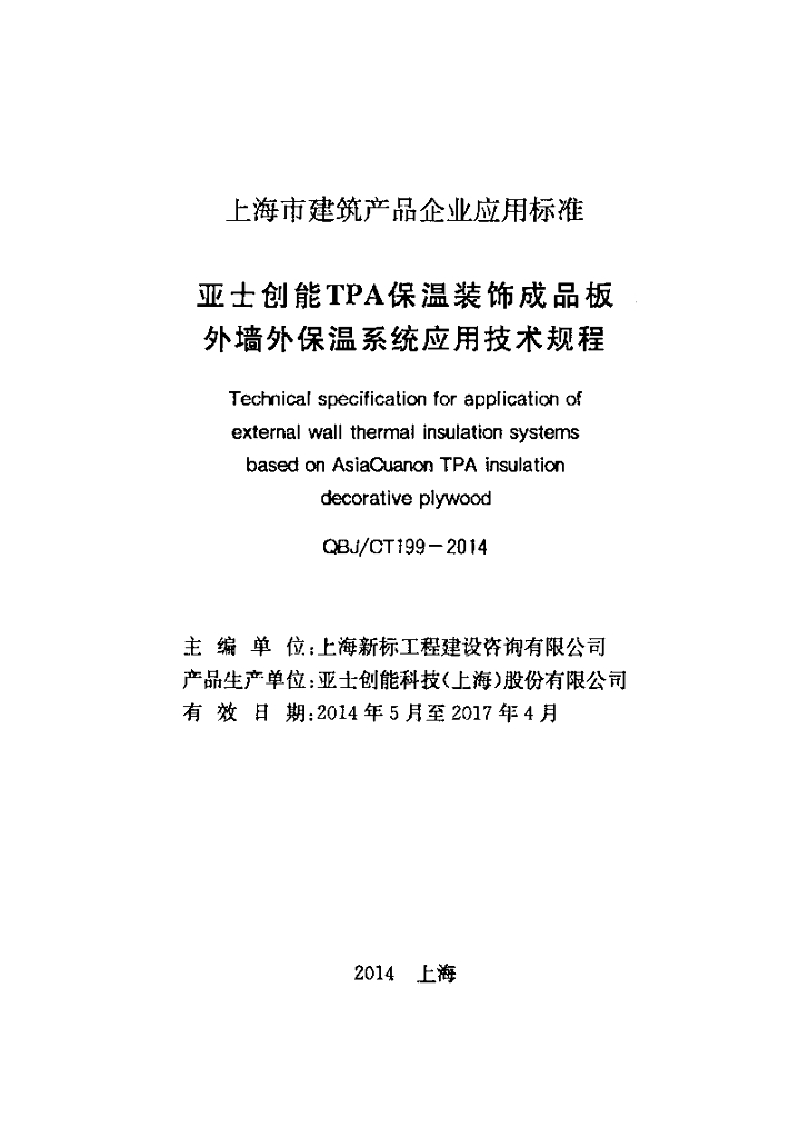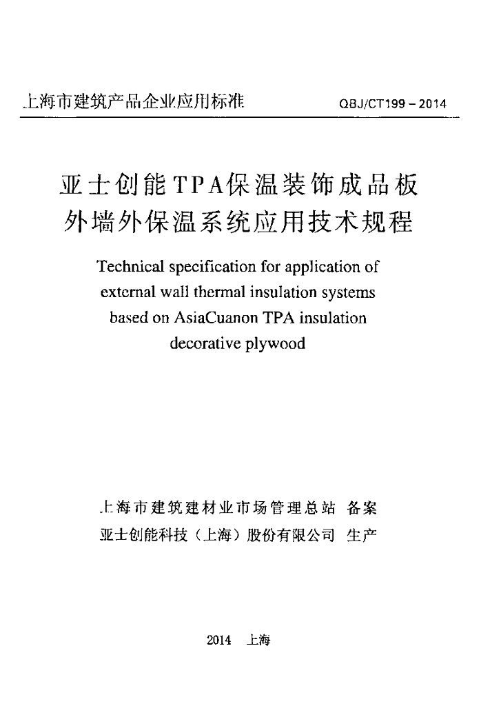 QBJ/CT 199-2014 亚士创能TPA保温装饰成品板 外墙外保温系统应用技术规程