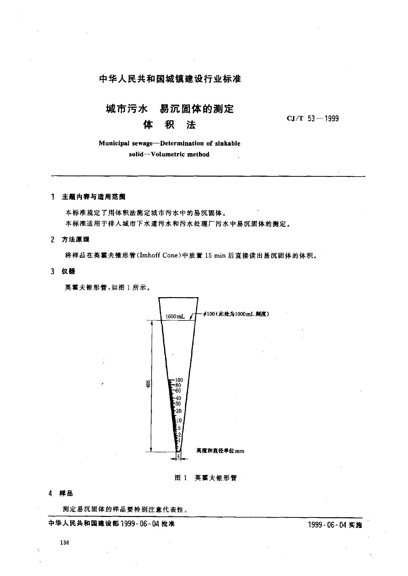 CJ 26.3-1991 城市污水水质检验方法标准 易沉固体的测定 体积法