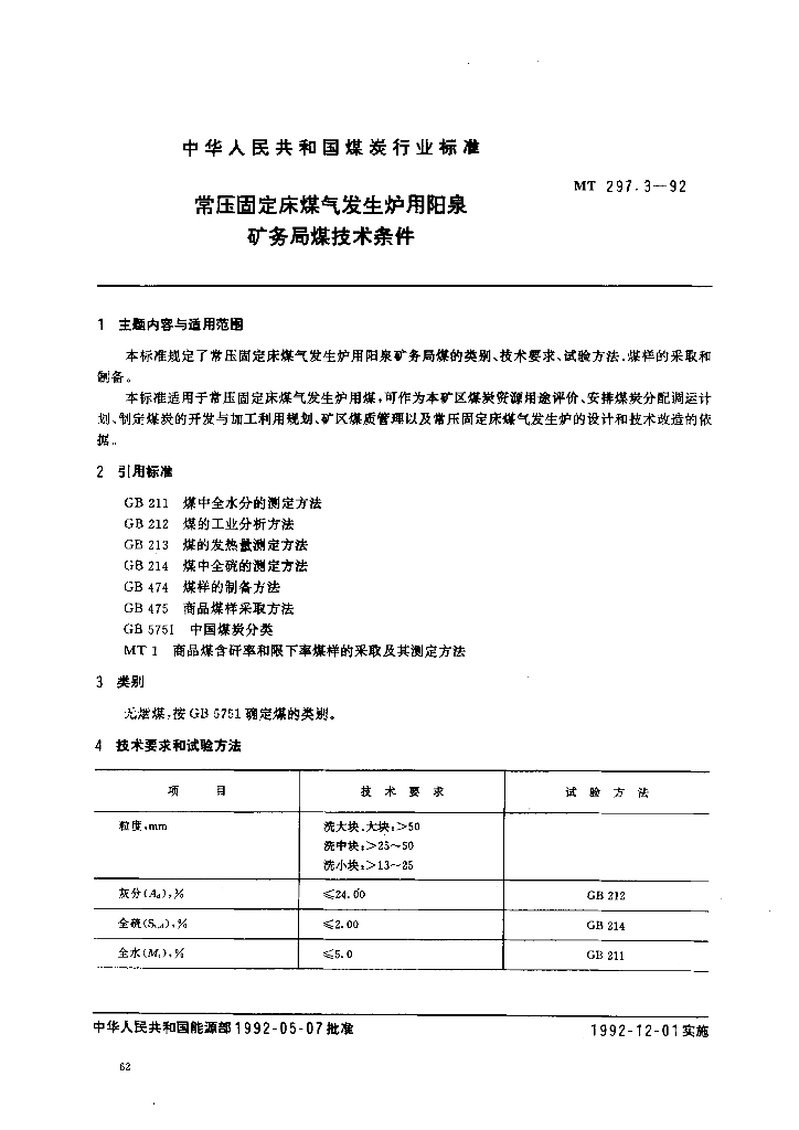 MT 297.3-1992 常压固定床煤气发生炉用阳泉矿务局煤技术条件