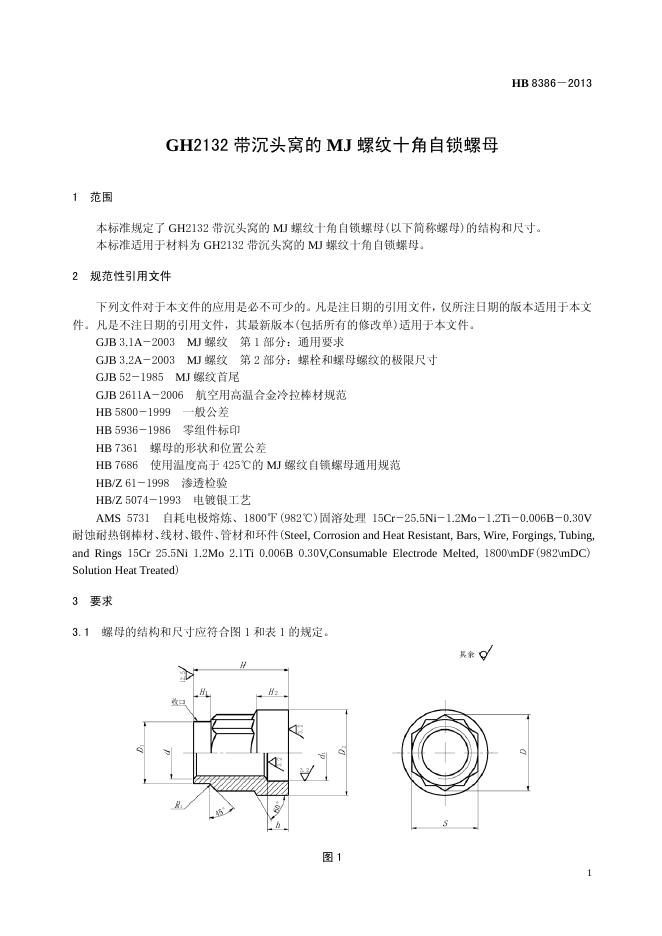 HB 8386-2013(2017) GH2132带沉头窝的MJ螺纹十角自锁螺母