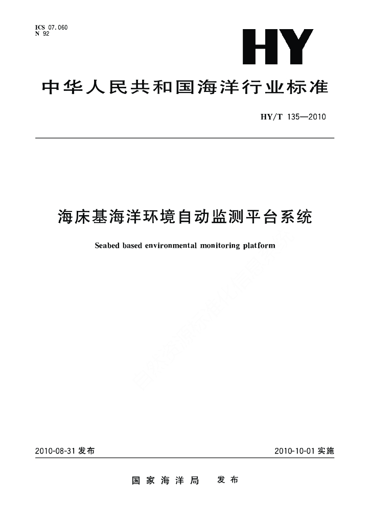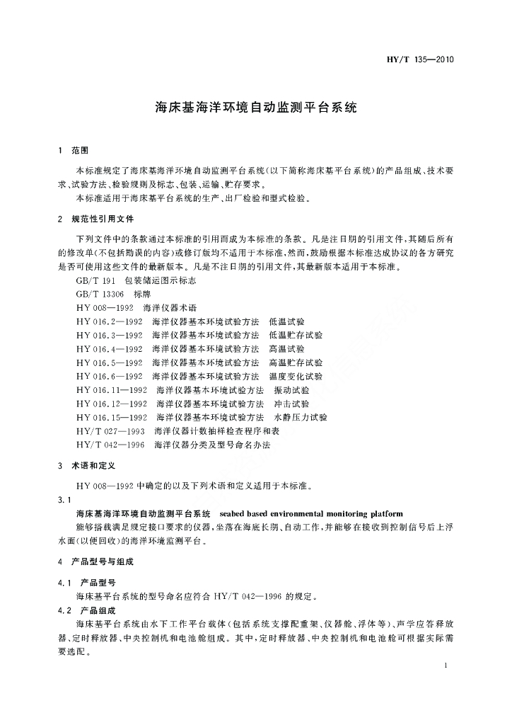 HY/T 135-2010 海床基海洋环境自动监测平台系统