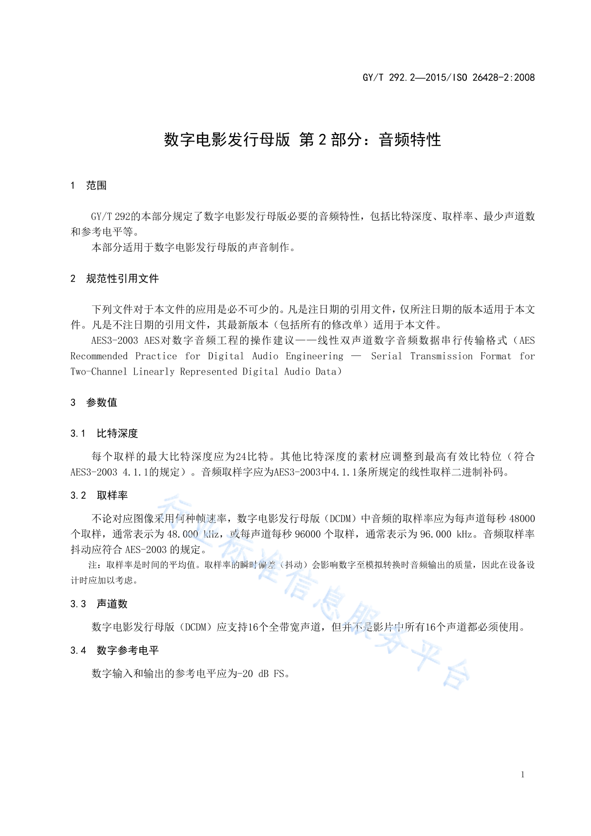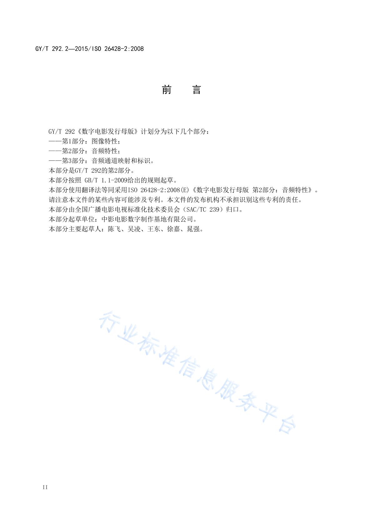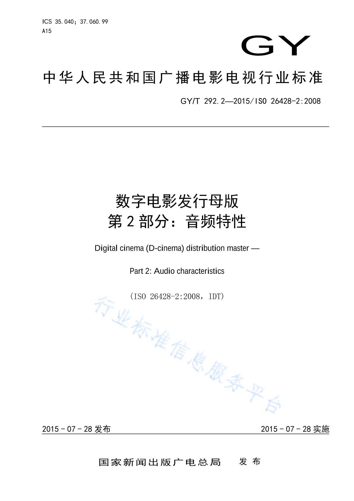 GY/T 292.2-2015 数字电影发行母版 第2部分:音频特性
