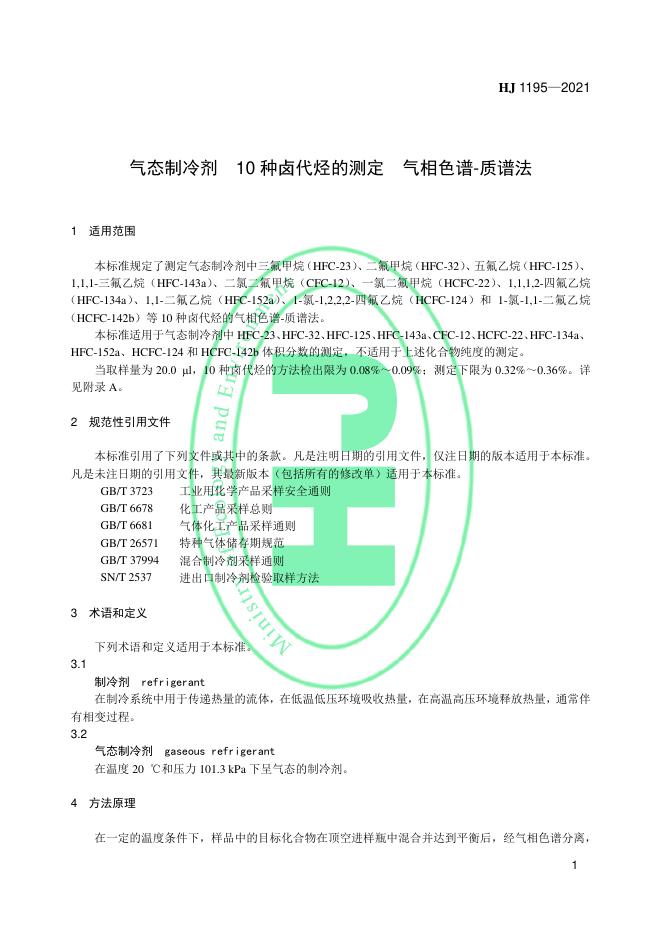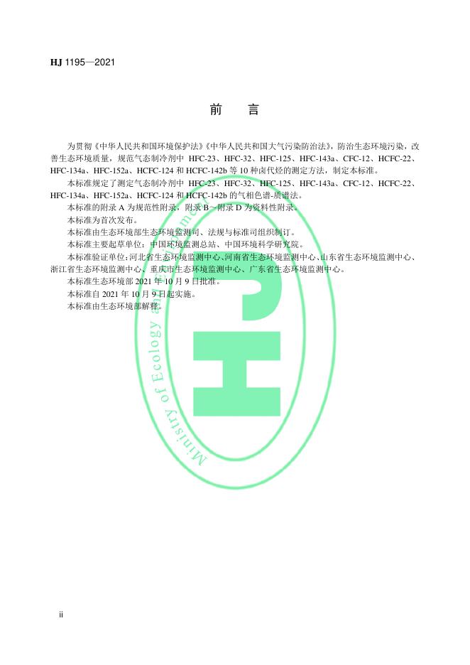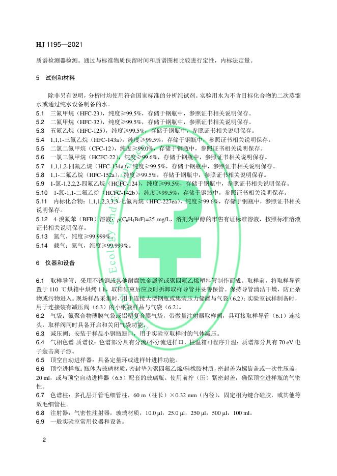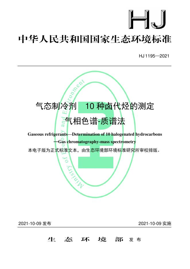 HJ 1195-2021 气态制冷剂 10种卤代烃的测定 气相色谱-质谱法