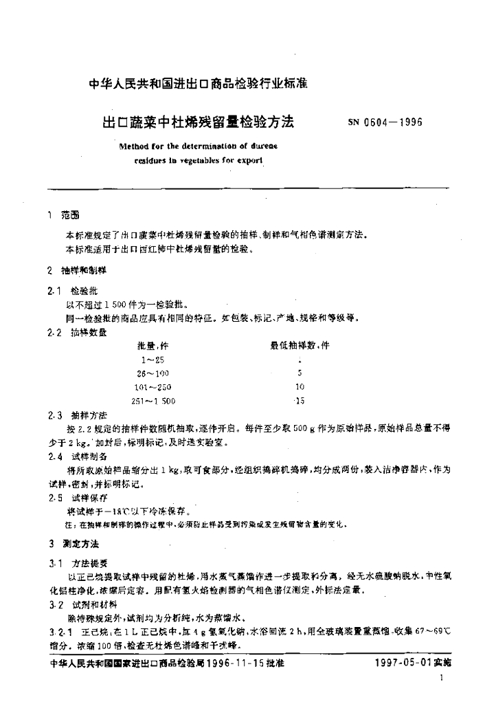 SN 0604-1996 出口蔬菜中杜烯残留量检验方法