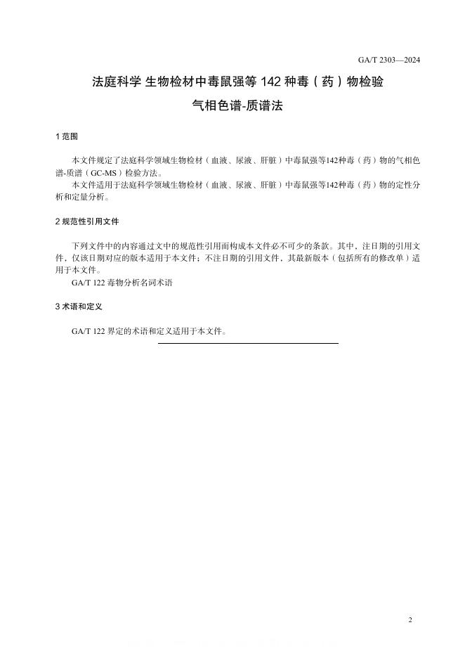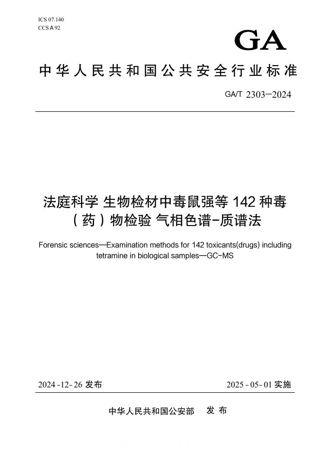 GA/T 2303-2024 法庭科学 生物检材中毒鼠强等142种毒(药)物检验 气相色谱-质谱法(摘要版)