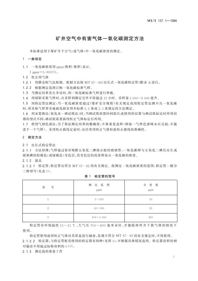 MT/T 137.1-1986 矿井空气中有害气体一氧化碳测定方法
