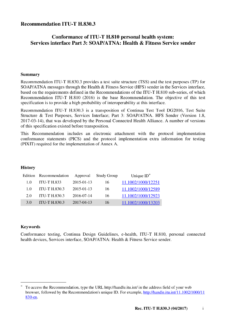 ITU-T H.830.3-2017 ITU-T H.810个人医疗卫生系统一致性 服务接口 第3部分 简单对象访问协议/审计跟踪及节点认证 健康和健身服务发送器