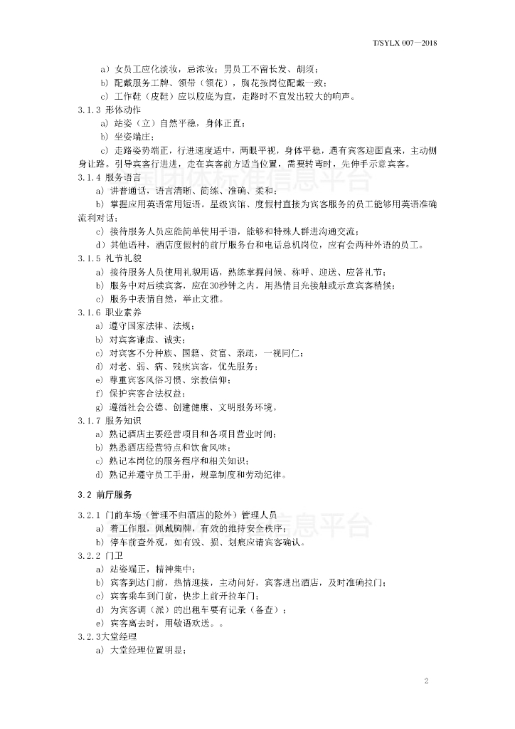 T/SYLX 007-2018 旅游住宿业服务规范