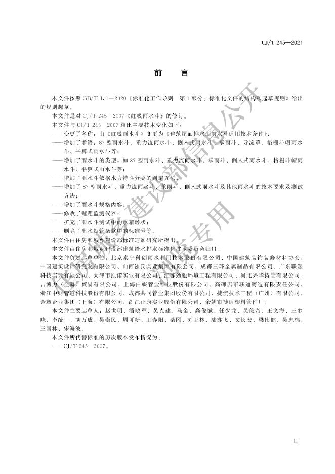 北京泰宁科创雨水利用技术股份有限公司、中国建筑装饰装修材料协会、中国建筑设计研究院有限公司、山西泫氏实业集团有限公司、成都三环金属制品有限公司、广东联塑科技实业有限公司、天津市凯诺实业有限公司、江苏劲驰环境工程有限公司、河北兴华铸管有限公司、吉博力(上海)贸易有限公司、上海白蝶管业科技股份有限公司、高碑店市联通铸造有限责任公司、浙江中财管道科技股份有限公司、成都共同管业集团股份有限公司、捷流技术工程(广州)有限公司、金塑企业集团(上海)有限公司、浙江正康实业股份有限公司、余姚市捷通塑料管件厂