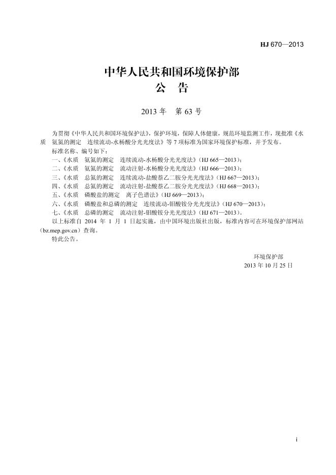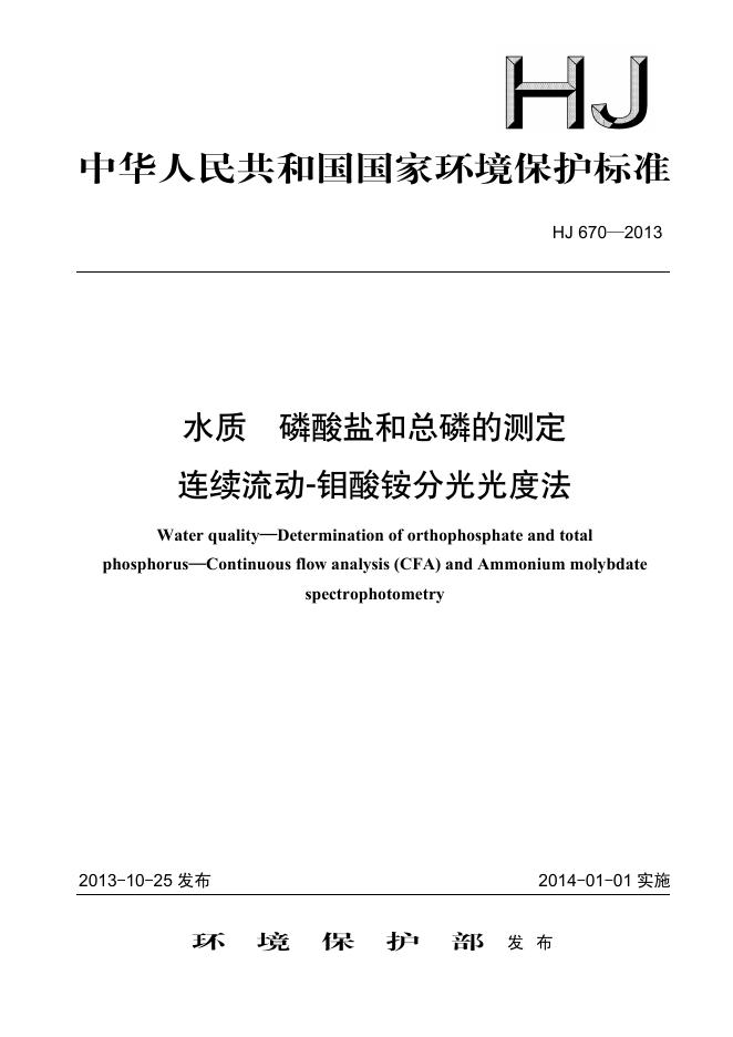 HJ 670-2013 水质 磷酸盐和总磷的测定 连续流动-钼酸铵分光光度法