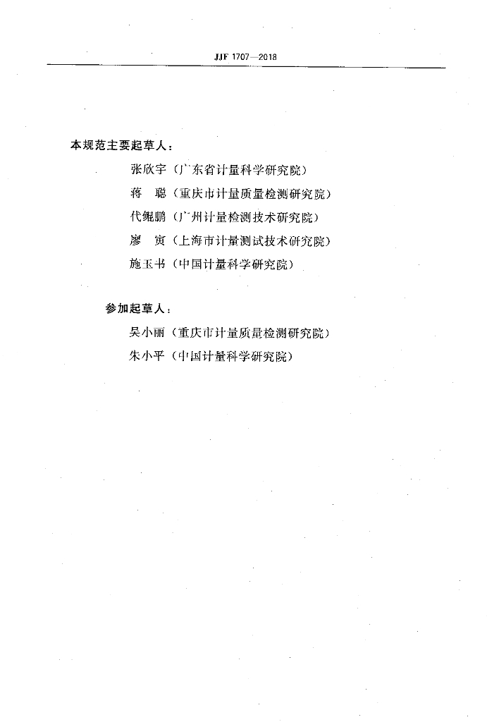 张欣宇(广东省计量科学研究院)、蒋聪(重庆市计量质量检测研究院) 、代银鹏(广州计量检测技术研究院) 、廖寅(上海市计量测试技术研究院) 、施玉书(中国计量科学研究院)、吴小丽(重庆市计量质量检测研究院) 、朱小平(中国计量科学研究院)
