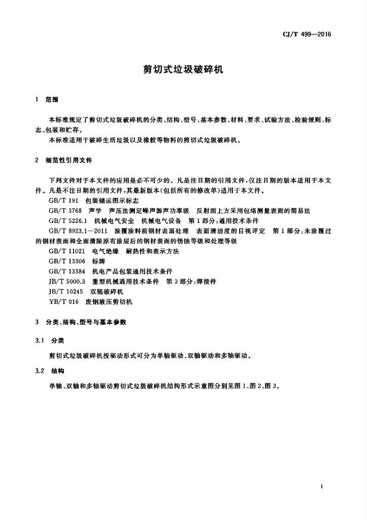 CJ/T 499-2016 剪切式垃圾破碎机