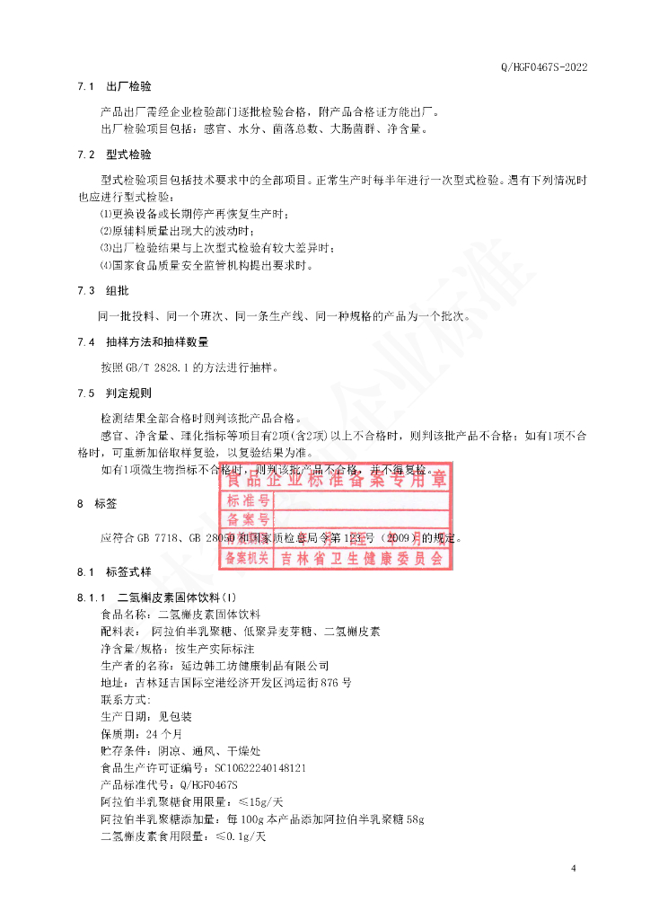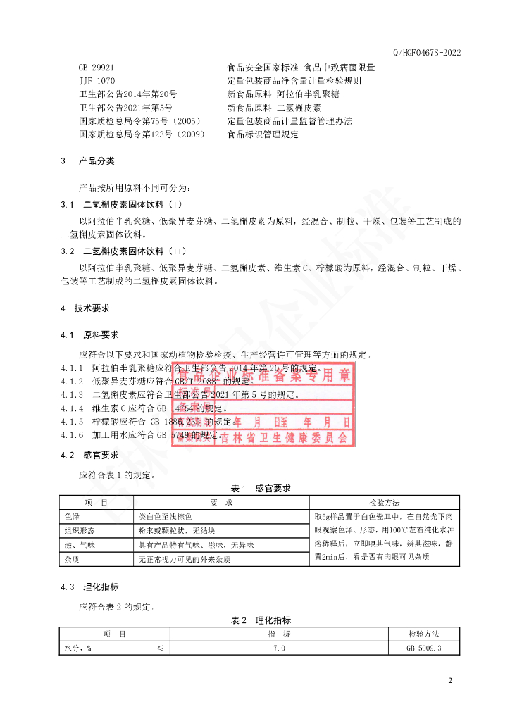 Q/HGF 0467S-2022 二氢槲皮素固体饮料