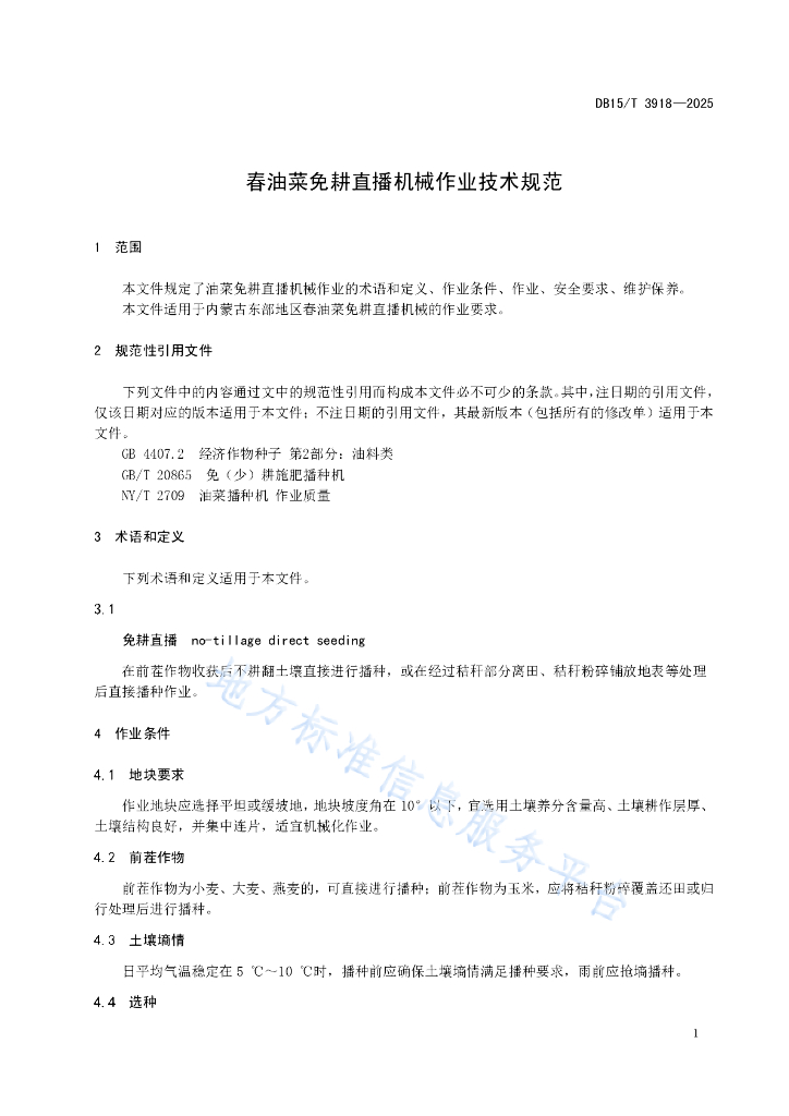 DB15/T 3918-2025 春油菜免耕直播机械作业技术规范
