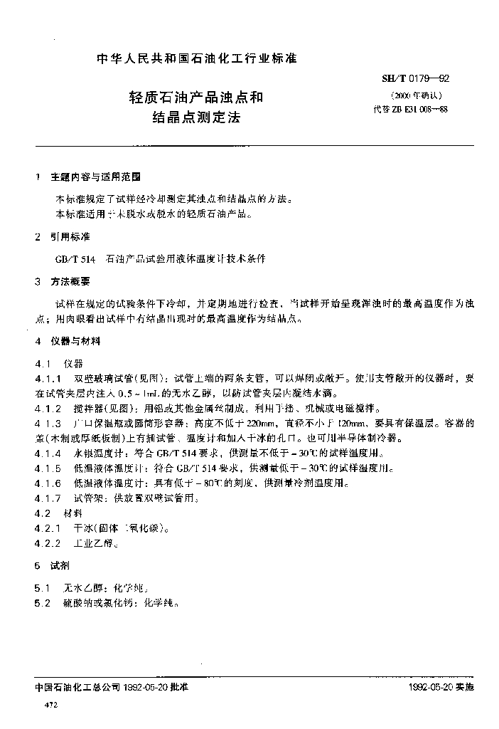 SH/T 0179-1992 轻质石油产品浊点和结晶点测定法