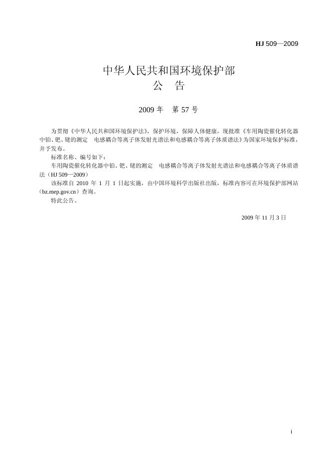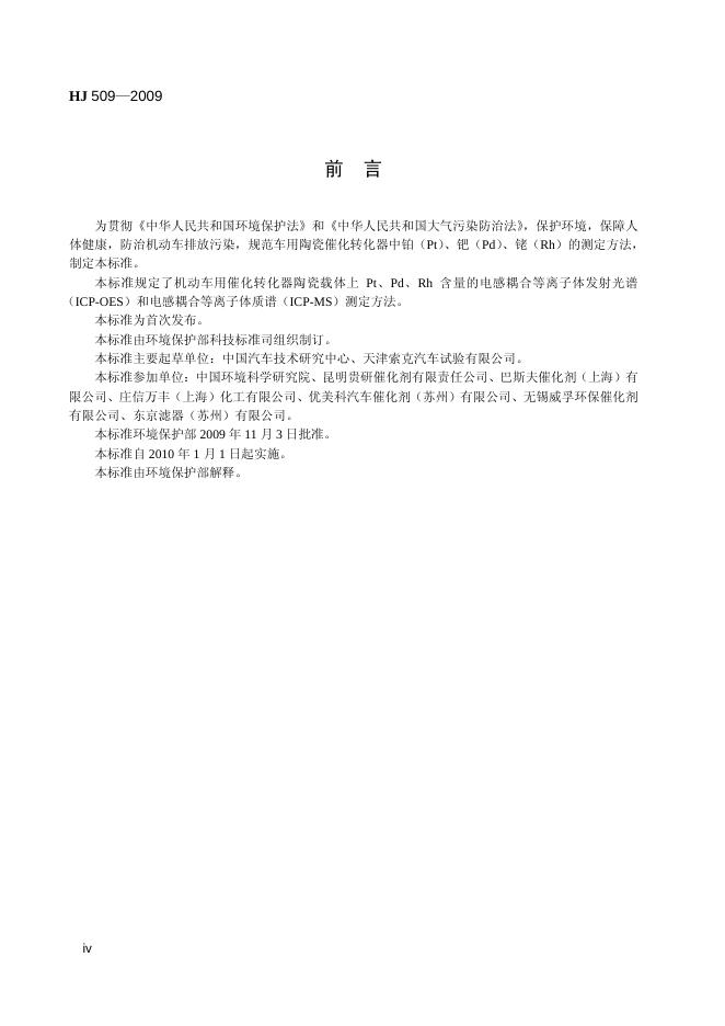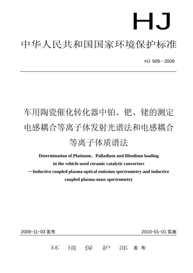 HJ 509-2009 车用陶瓷催化转化器中铂、钯、铑的测定 电感耦合等离子体发射光谱法和电感耦合等离子体质谱法