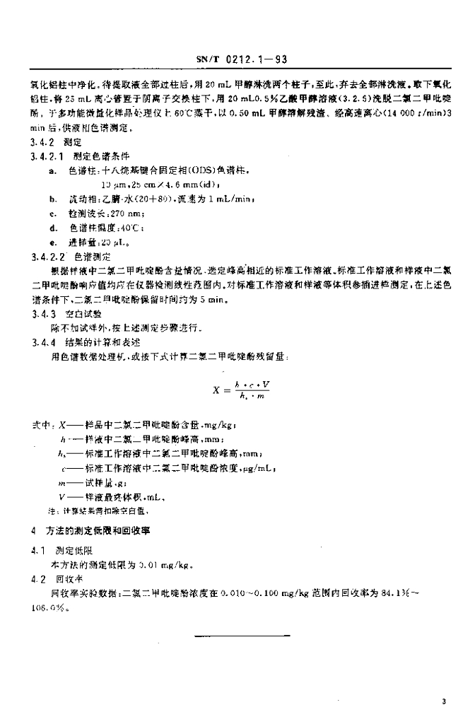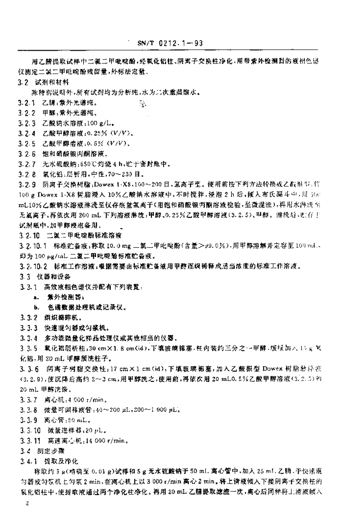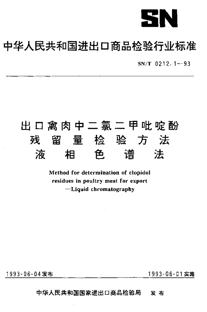 SN/T 0212.1-1993 出口禽肉中二氯二甲吡啶酚残留量检验方法 液相色谱法