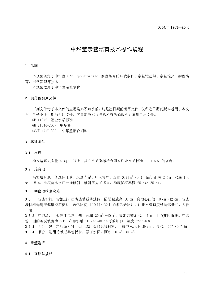 DB34/T 1209-2010 中华鳖亲鳖培育技术操作规程