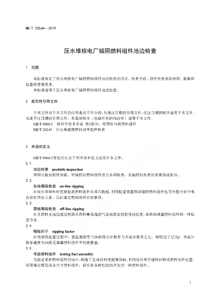 NB/T 20564-2019 压水堆核电厂辐照燃料组件池边检查