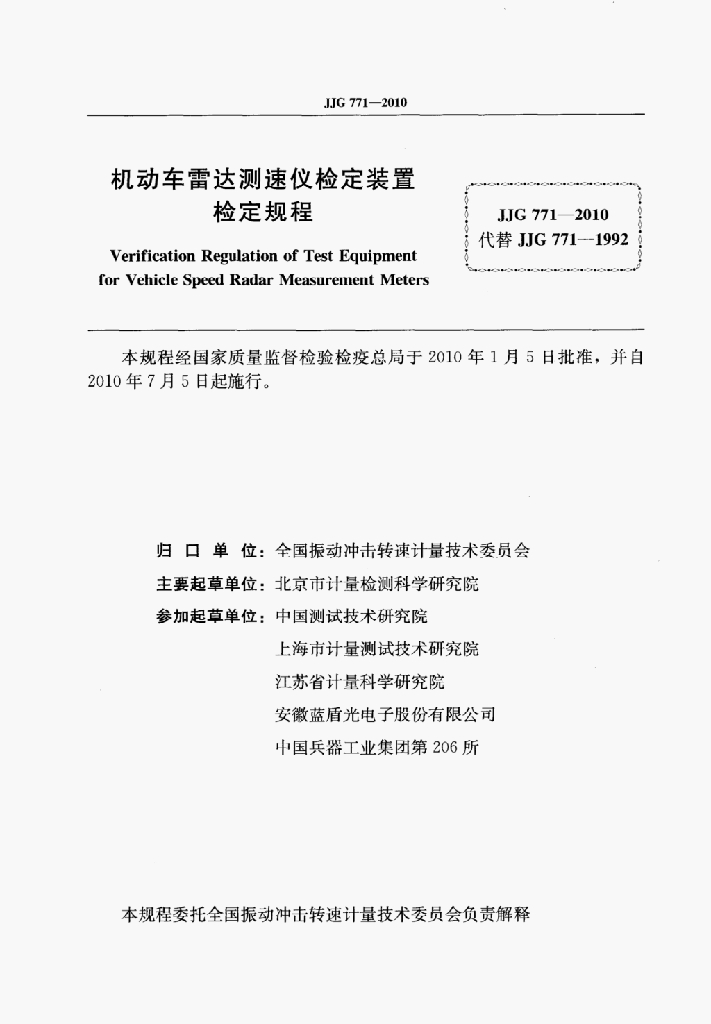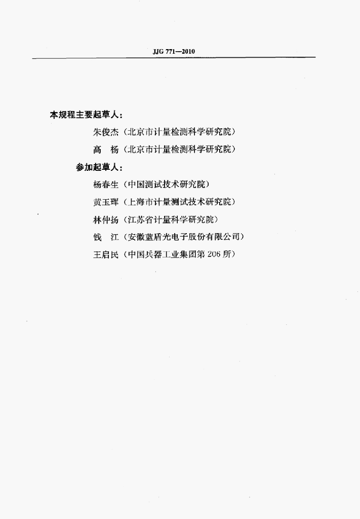 朱俊杰(北京市计量检测科学研究院)、高杨(北京市计量检测科学研究院)、杨春生(中国测试技术研究院)、黄玉浑(上海市计量测试技术研究院)、林仲扬(江苏省计量科学研究院)、钱江(安徽蓝盾光电子股份有限公司)、王启民(中国兵器工业集团第206所)