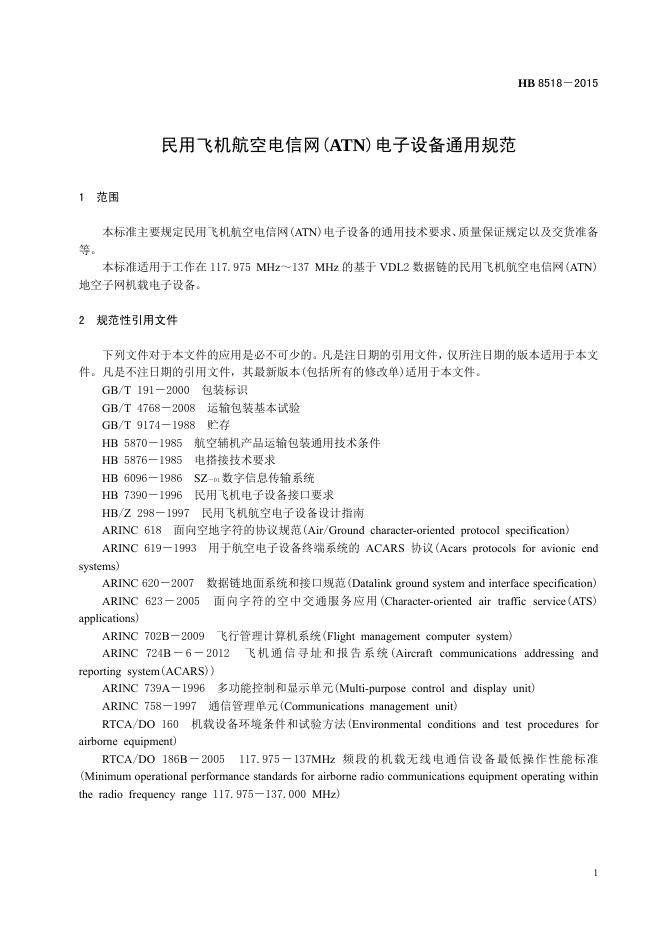 HB 8518-2015 民用飞机航空电信网(ATN)电子设备通用规范(2017)
