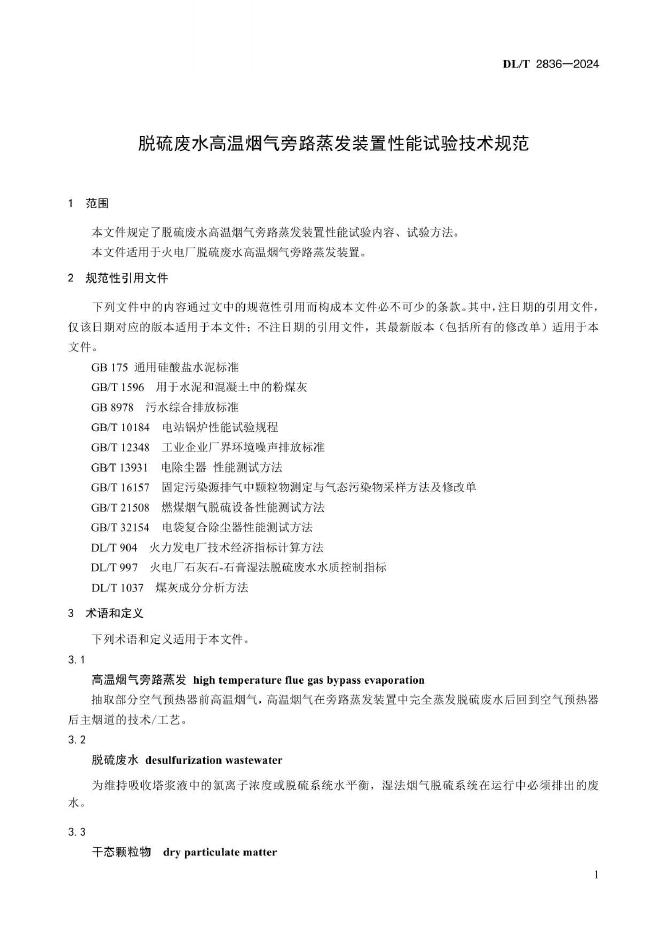 DL/T 2836-2024 脱硫废水高温烟气旁路蒸发装置性能试验技术规范