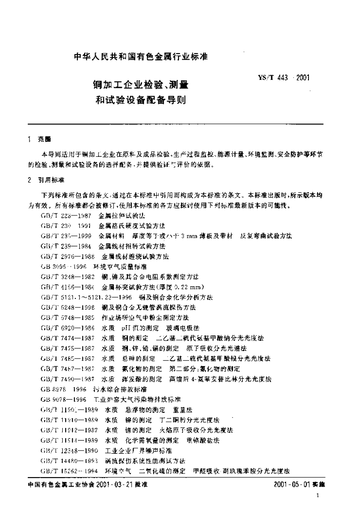 YS/T 443-2001 铜加工企业检验、测量和试验设备配备导则