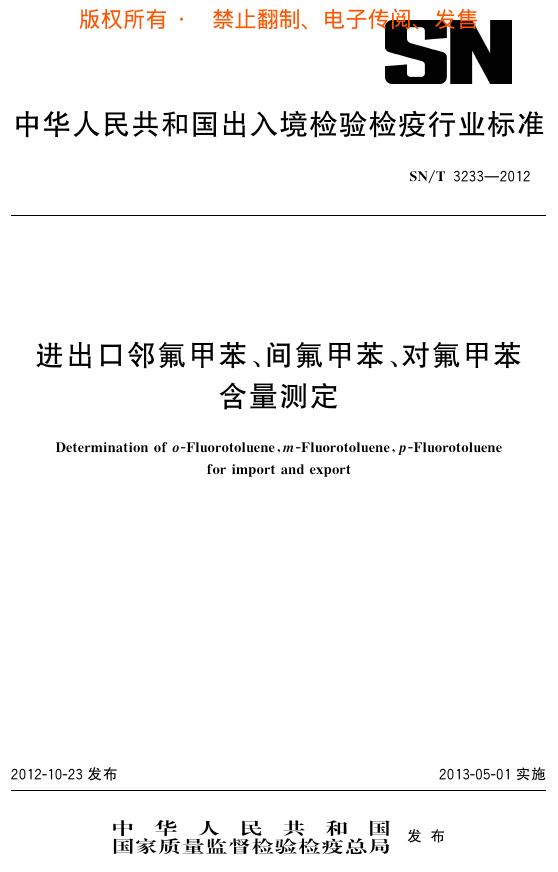 SN/T 3233-2012 进出口邻氟甲苯、间氟甲苯、对氟甲苯含量测定