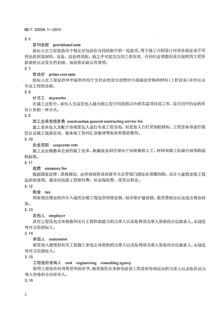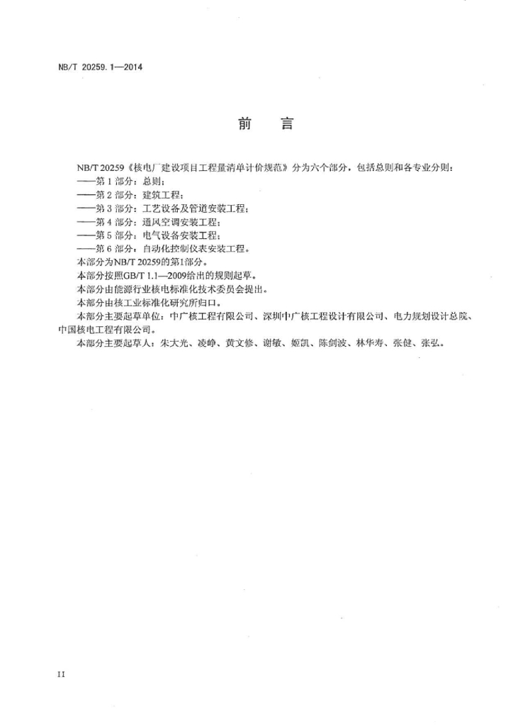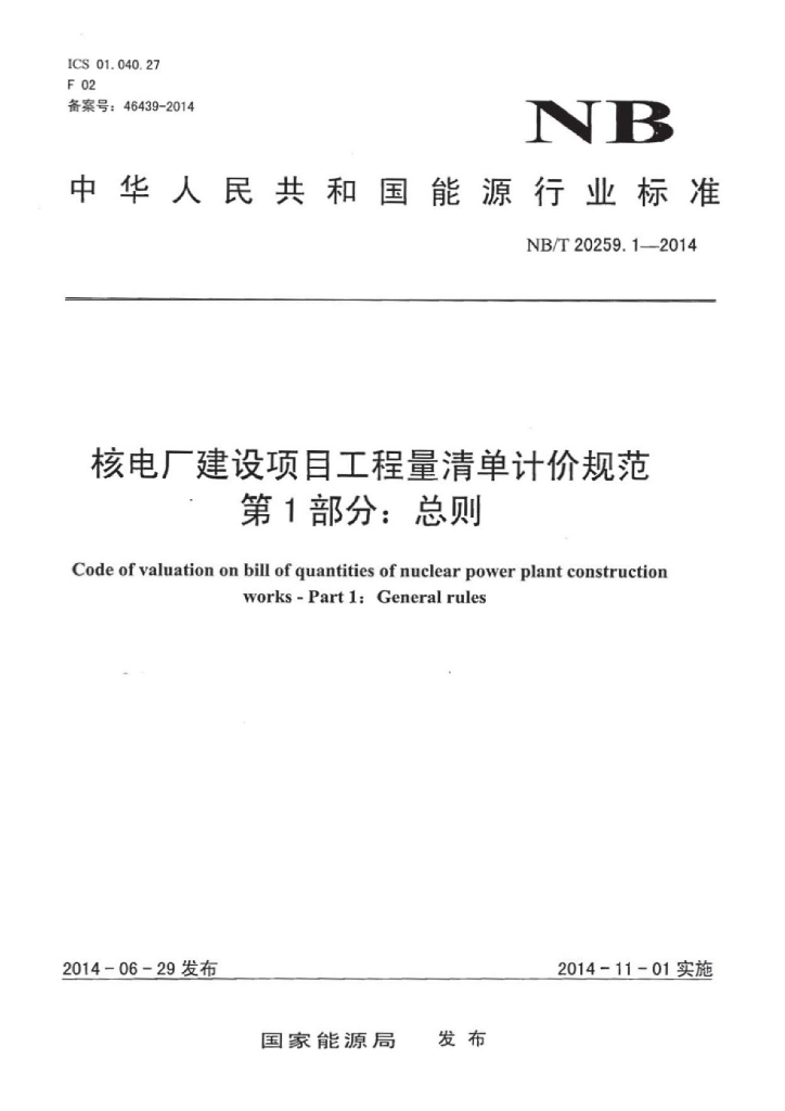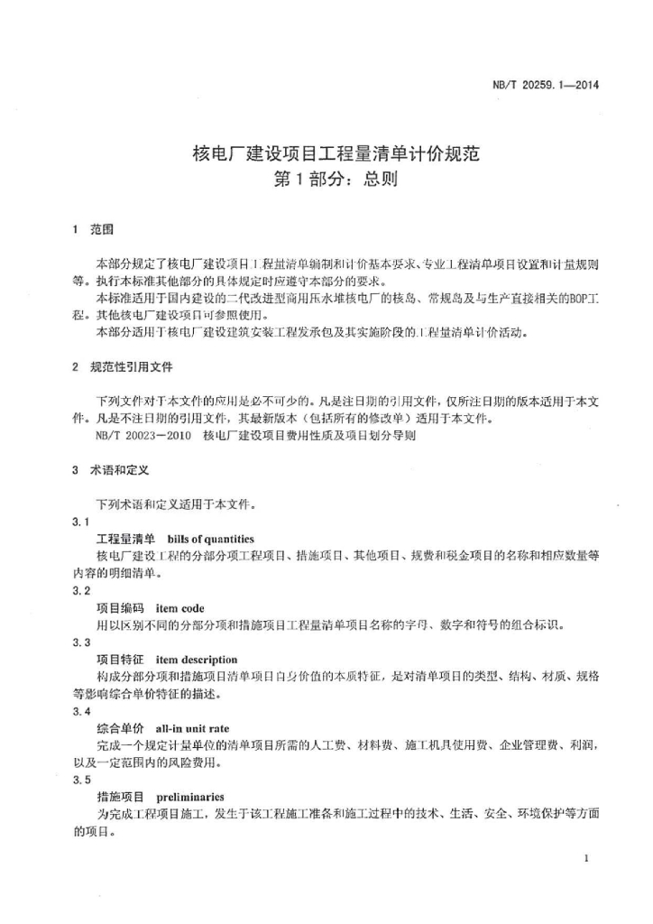 NB/T 20259.1-2014 核电厂建设项目工程量清单计价规范 第1部分:总则