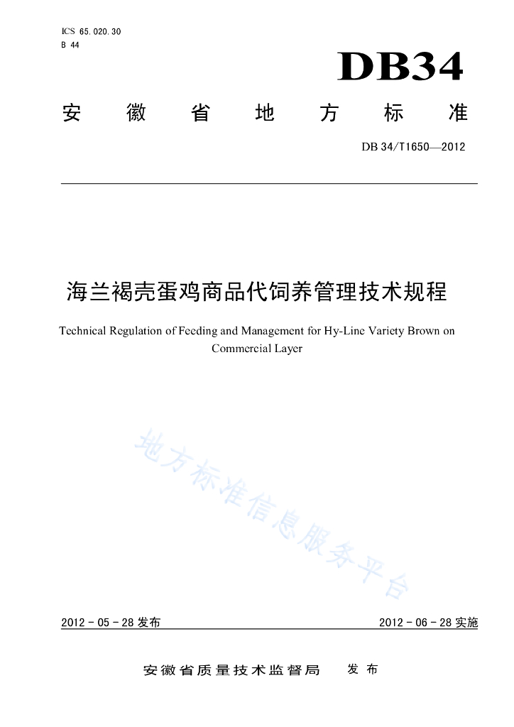 DB34/T 1650-2012 海兰褐壳蛋鸡商品代饲养管理技术规程