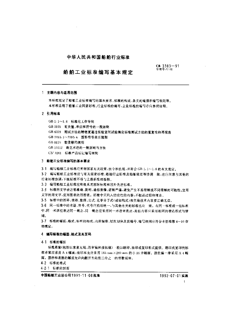 CB 3383-1991 船舶工业标准编写基本规定