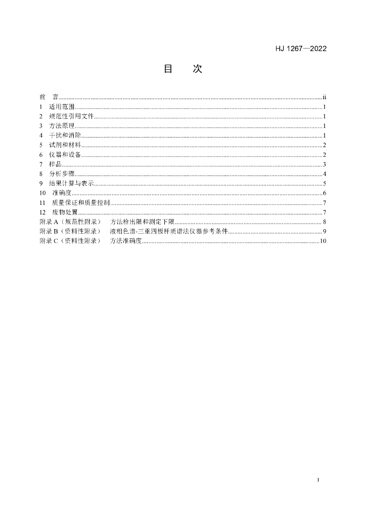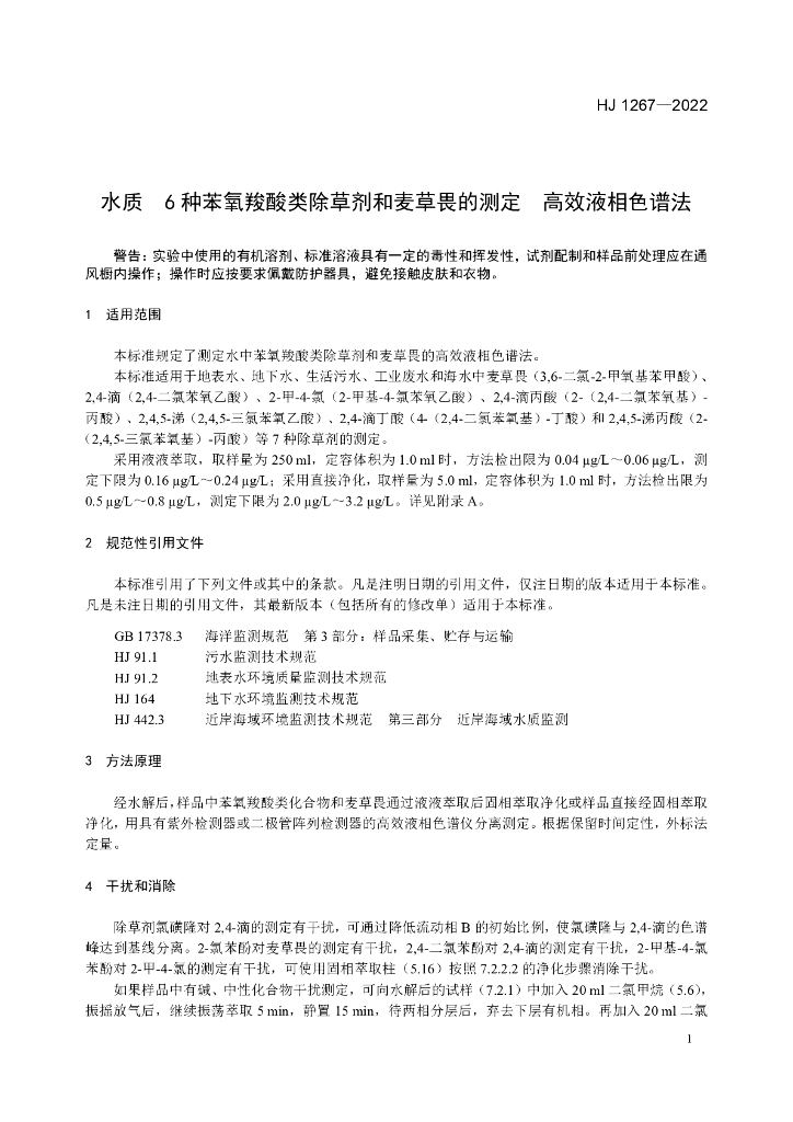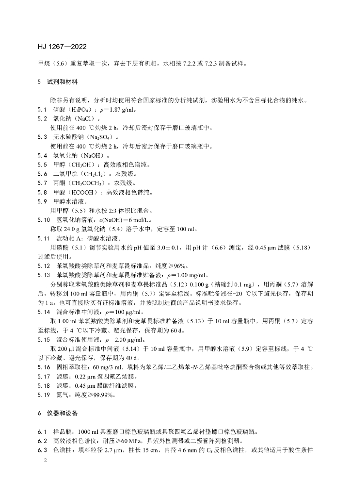 HJ 1267-2022 水质 6种苯氧羧酸类除草剂和麦草畏的测定 高效液相色谱法