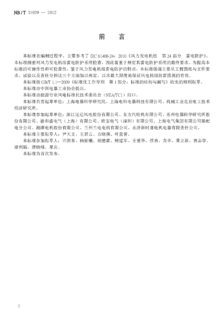 NB/T 31039-2012 风力发电机组雷电防护系统技术规范