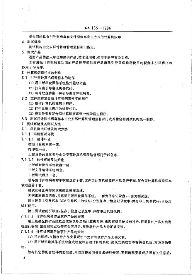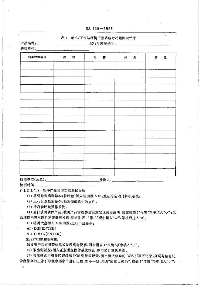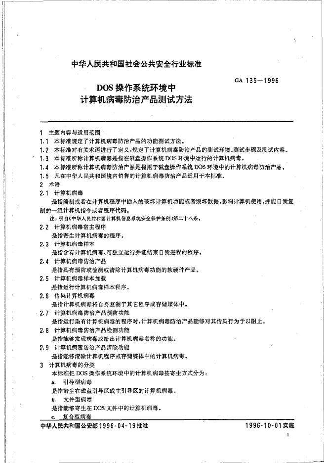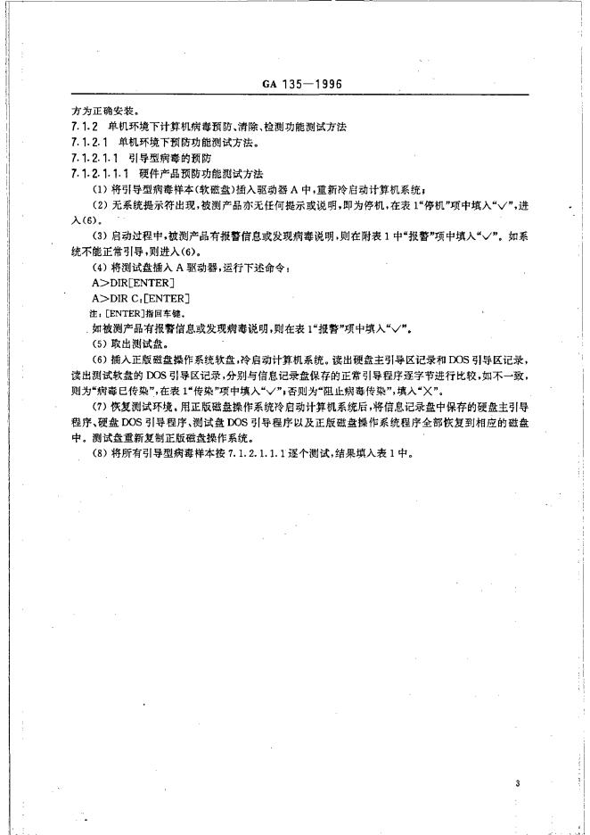 GA 0135-1996 DOS操作环境中计算机病毒防治产品测试方法