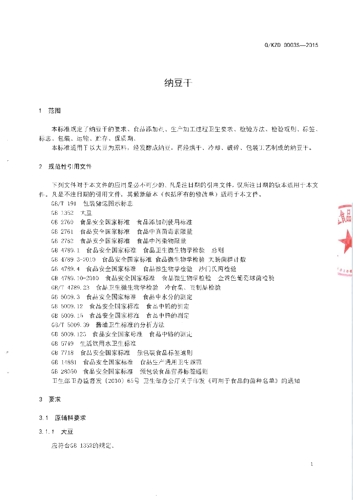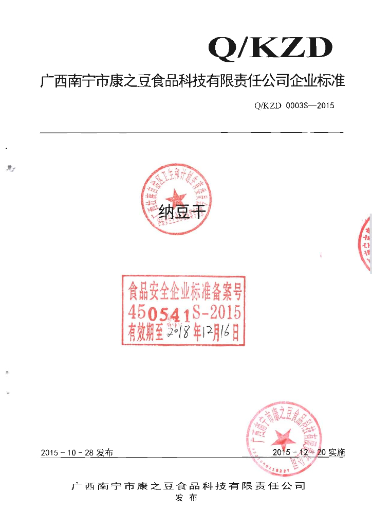 Q/KZD 0003S-2015 广西南宁市康之豆食品科技有限责任公司 纳豆干