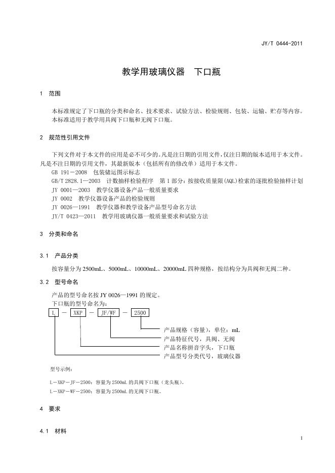 JY/T 0444-2011 教学用玻璃仪器 下口瓶