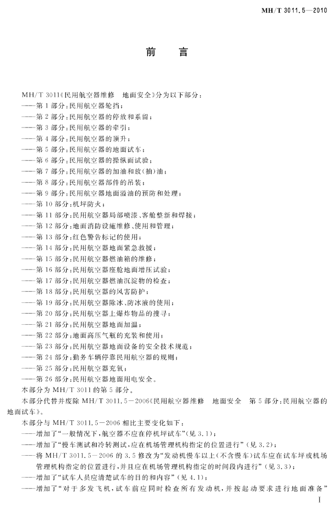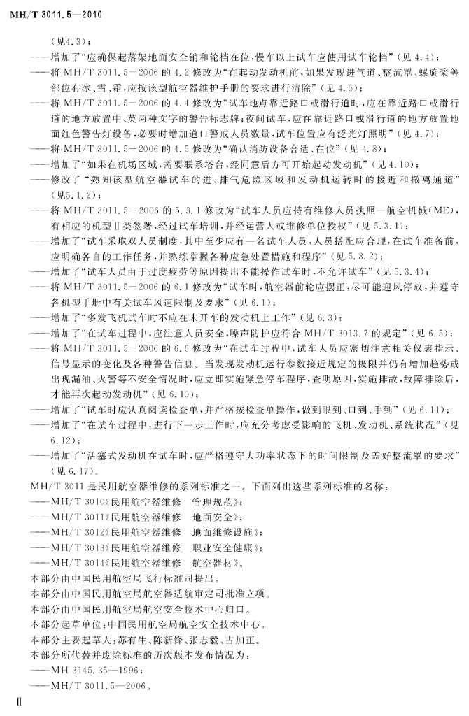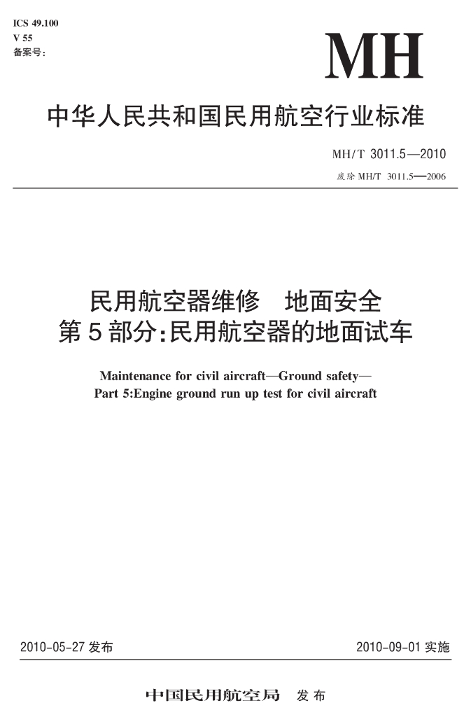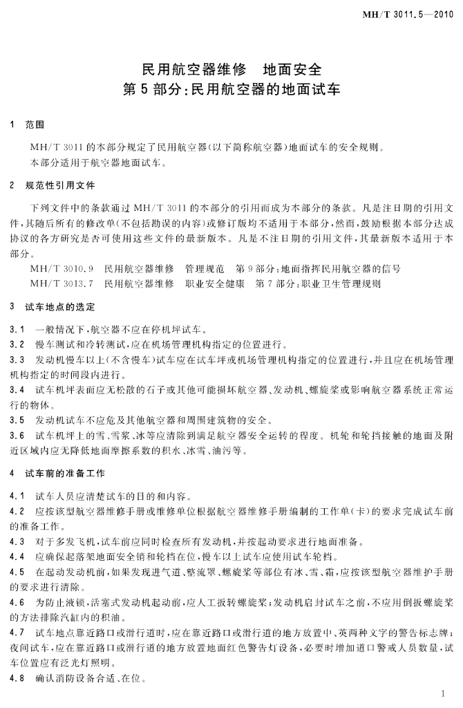 MH/T 3011.5-2010 民用航空器维修 地面安全 第5部分:民用航空器的地面试车