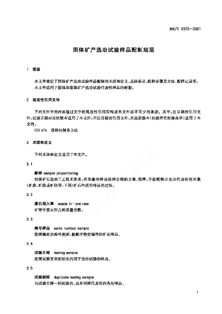 DZ/T 0372-2021 固体矿产选冶试验样品配制规范