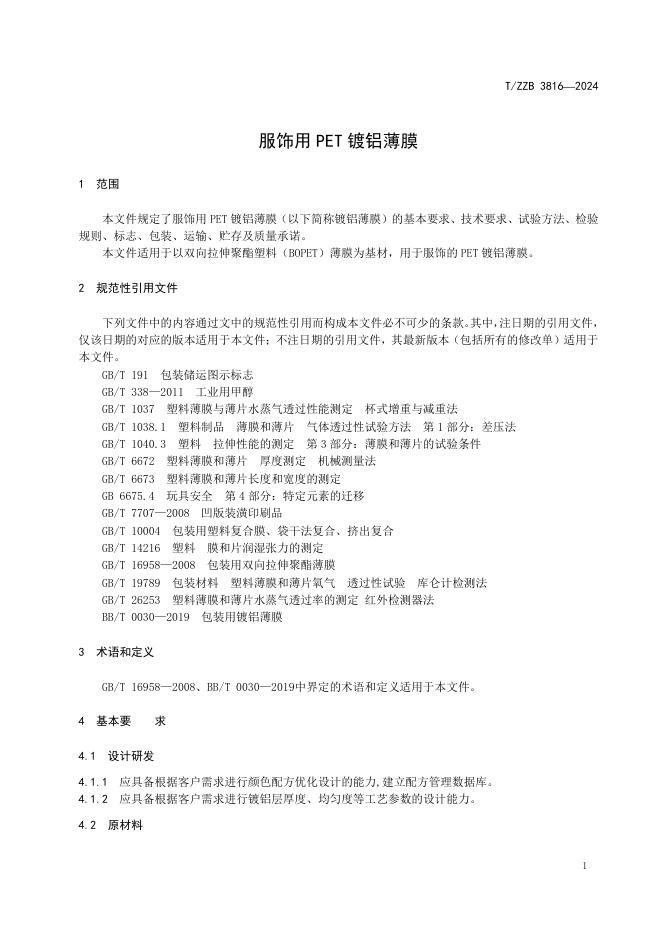 T/ZZB 3816-2024 服饰用PET镀铝薄膜