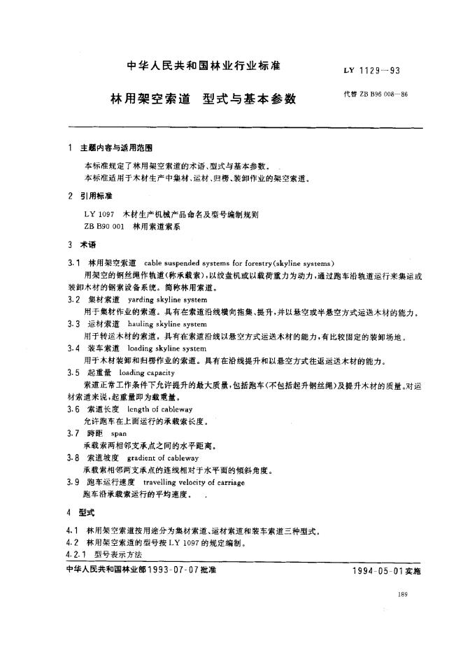 LY/T 1129-1993 林用架空索道 型式与基本参数