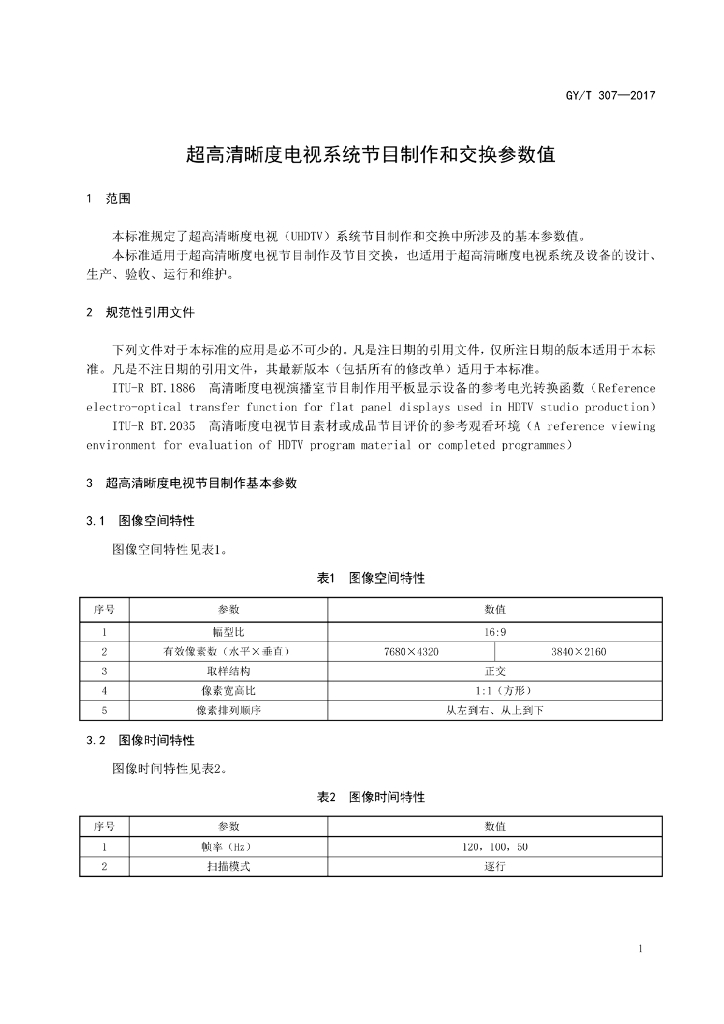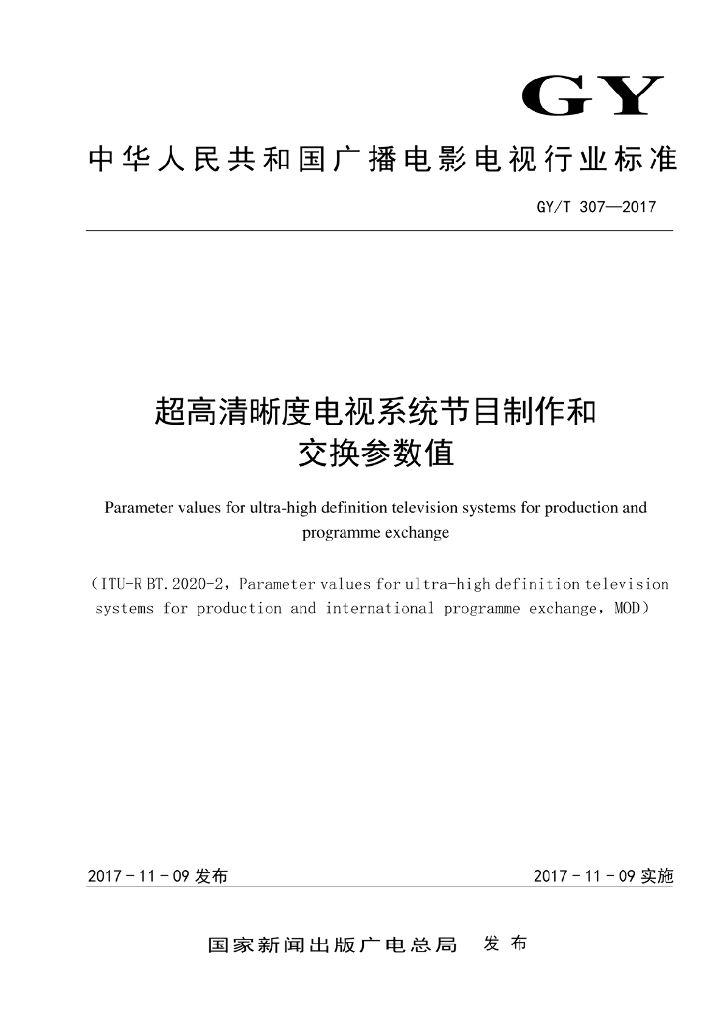 GY/T 307-2017 超高清晰度电视系统节目制作和交换参数值