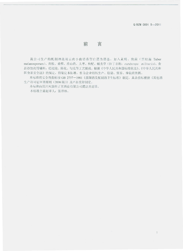 Q/BZW 0001S-2011 配制酒